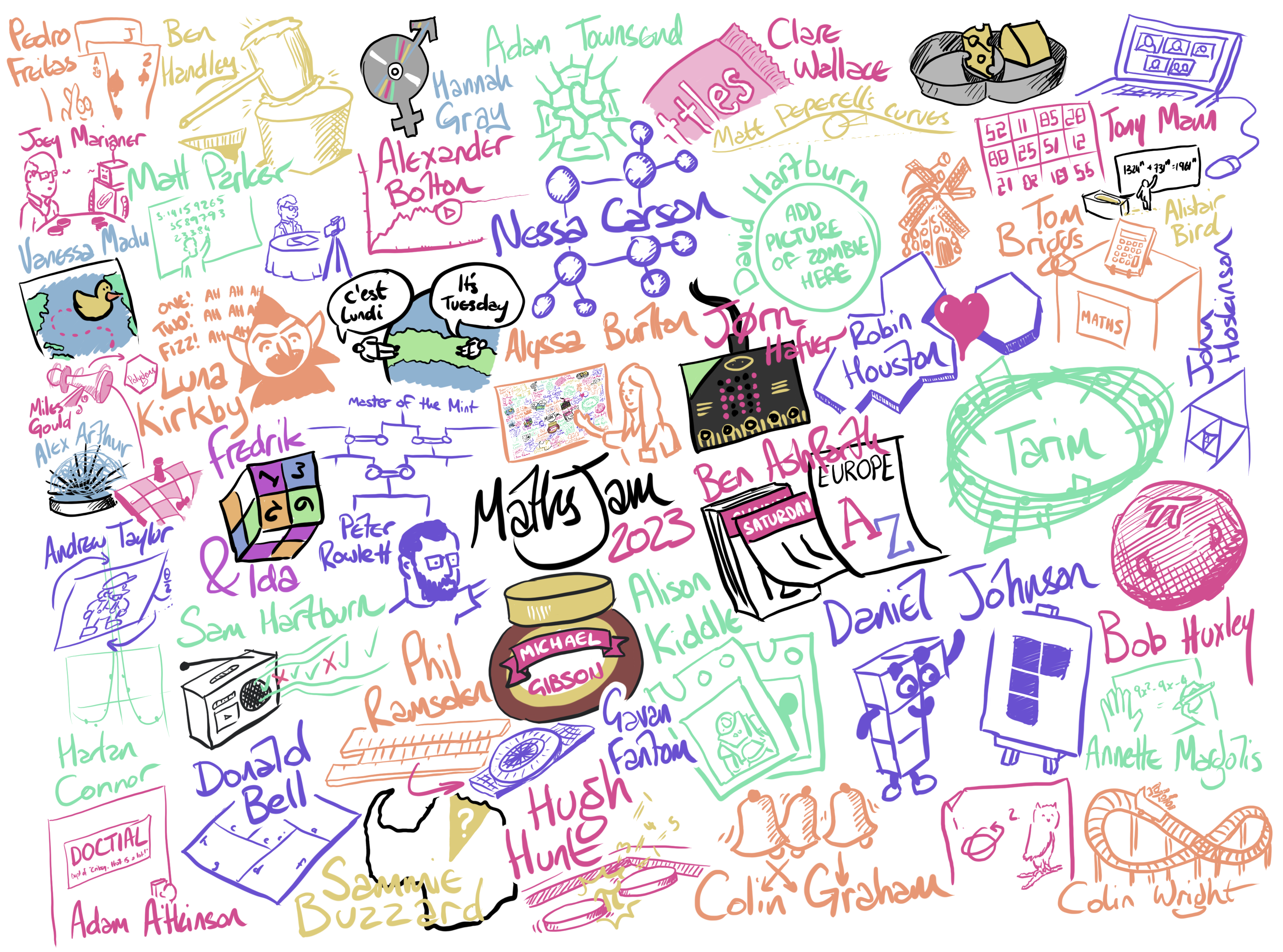 Andrew Taylor has produced a poster of the things that happened at MathsJam 2023. There is also a Cake page here with the photos of cakes entered in the cake competition.